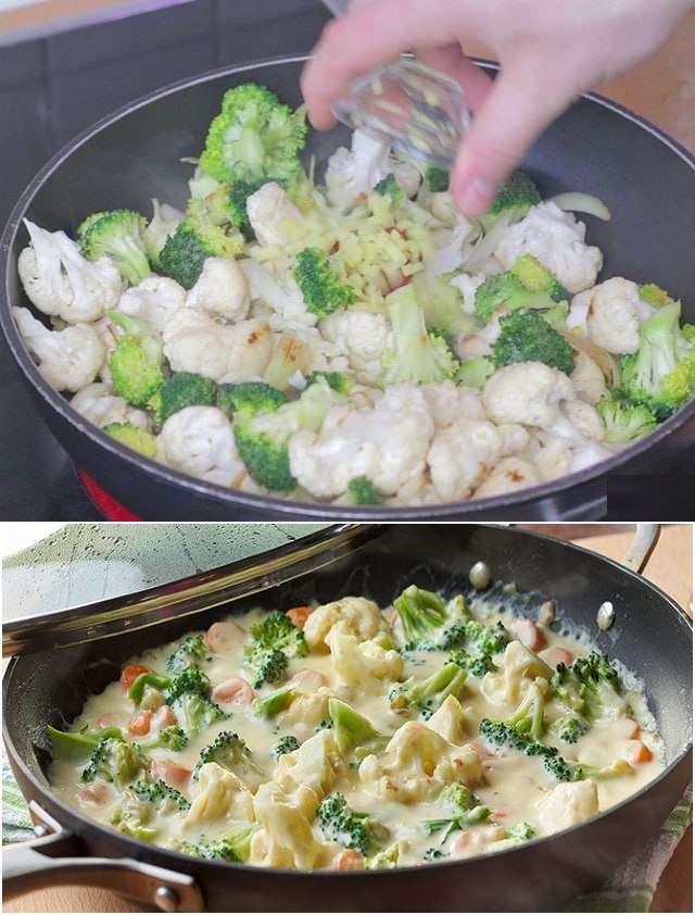 Zubereitung ( Blumenkohl-Brokkoli-Gemüse mit cremiger Käsesauce ) :