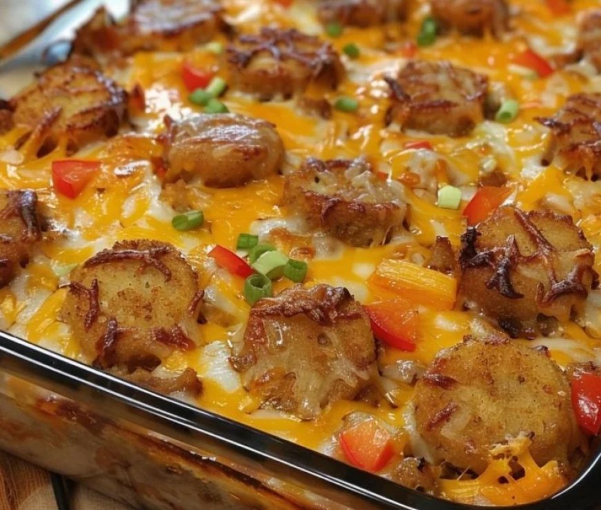 Legen Sie die gefrorenen Kartoffelpuffer in einer einzelnen Schicht auf die Mischung.