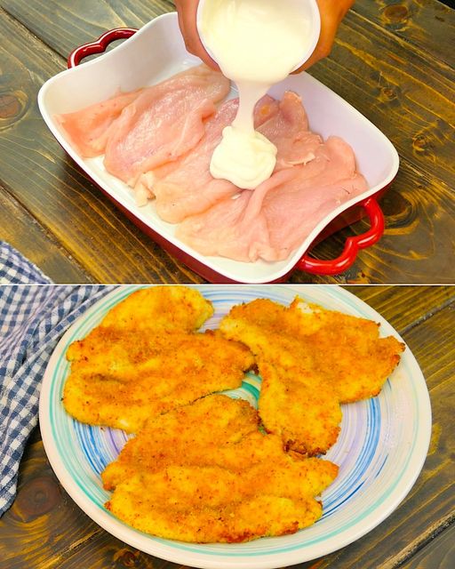 Leichtere Variante der klassischen gebratenen Hähnchenschnitzel , schnell und einfach mit nur wenigen einfachen Zutaten zubereitet. Alles, was Sie tun müssen, ist, das Fleisch mit Volljoghurt und einer Prise Salz zu massieren, es eine halbe Stunde im Kühlschrank marinieren zu lassen und es dann mit einer leichten, eifreien Panade aus Semmelbröseln und geriebenem Parmesan zu bestreichen . Anschließend wird das panierte Hähnchen auf ein mit Backpapier ausgelegtes Backblech gelegt, mit einem Schuss Olivenöl extra vergine beträufelt und anschließend bei 180 °C goldbraun gegart: für ein knuspriges und unwiderstehliches Ergebnis, das Groß und Klein begeistern wird.