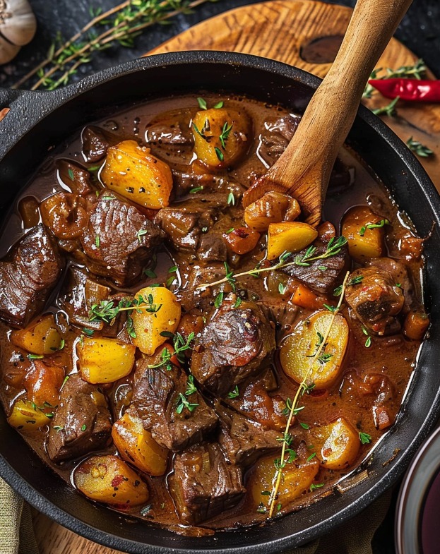 Das Olivenöl in einem großen Topf bei mittlerer bis hoher Hitze erhitzen. Die Rindfleischwürfel hinzufügen und von allen Seiten anbraten. Das Fleisch herausnehmen und beiseitestellen.