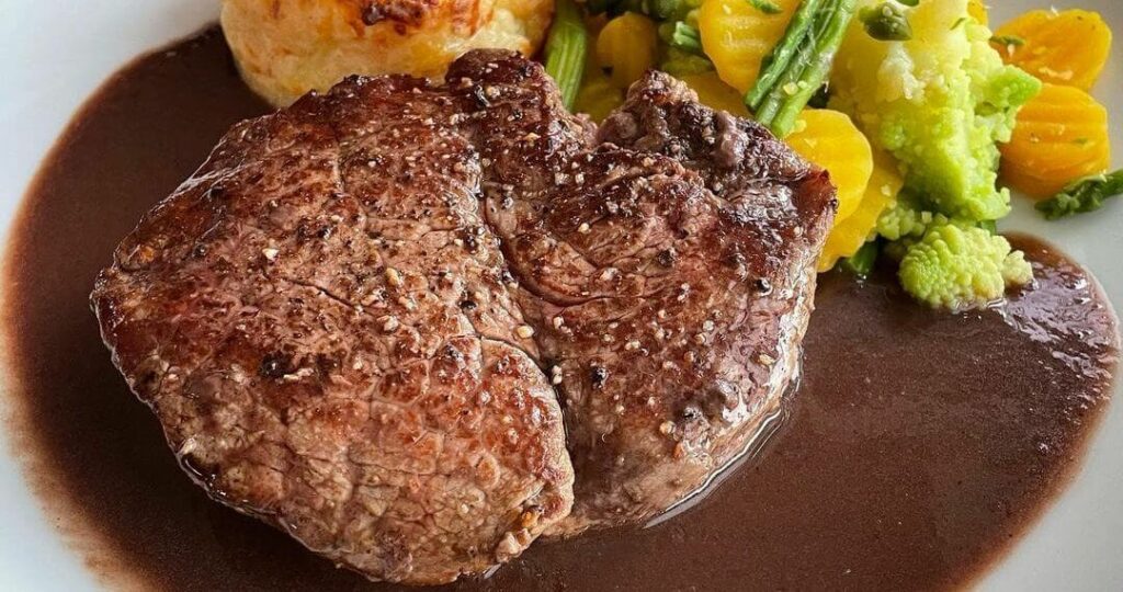 Das Pflanzenöl in einer Pfanne erhitzen und die Filetsteaks darin von beiden Seiten scharf anbraten, bis sie eine schöne Kruste haben. Die Steaks aus der Pfanne nehmen und beiseite stellen.